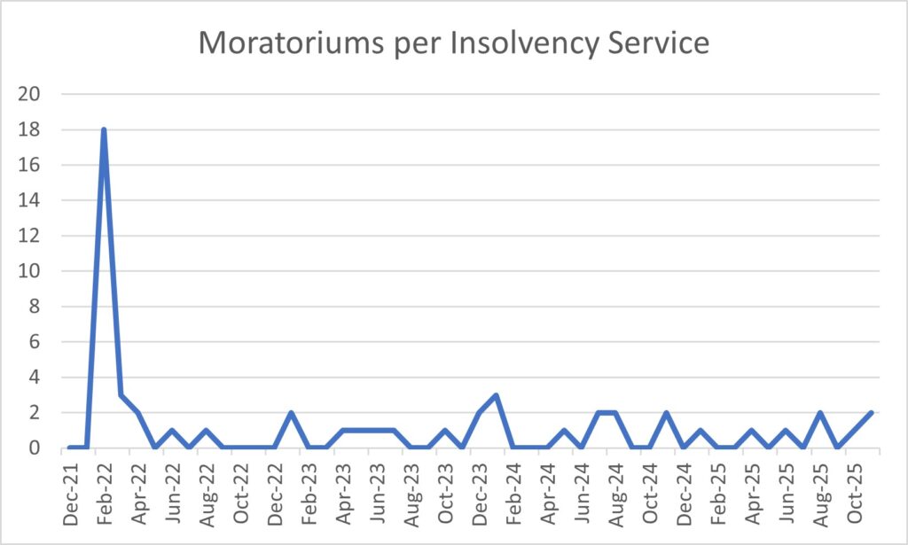 Although there are very few moratoriums and restructuring plans, I thought I might as well provide graphs for those too. I have drawn the data for these from the Insolvency Service’s monthly statistics.