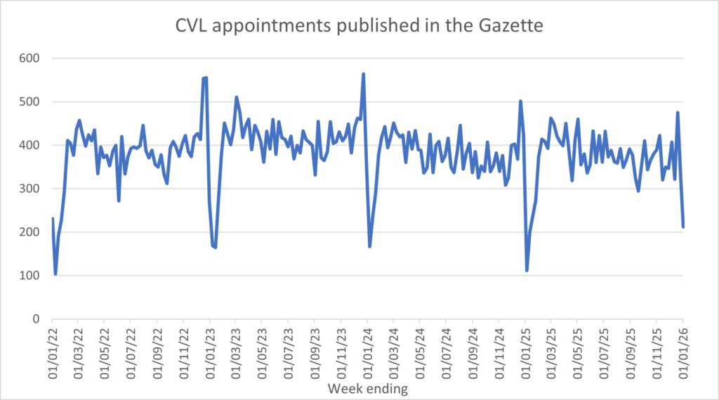 The following graphs show the numbers of notices of appointment published in the Gazette on a weekly basis. Therefore, they likely lag a week or so behind the actual dates of appointment. The graphs are updated each week.