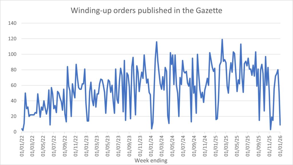 The quarterly figures for dissolutions (voluntary and compulsory) have been drawn from Companies House’s statistics. Liquidations pale into insignificance against the number of dissolutions: over the last four reported quarters, there were over 750,000 dissolutions (with a 27% leap in Q2 2025/26) but only c.33,000 liquidations (all types).