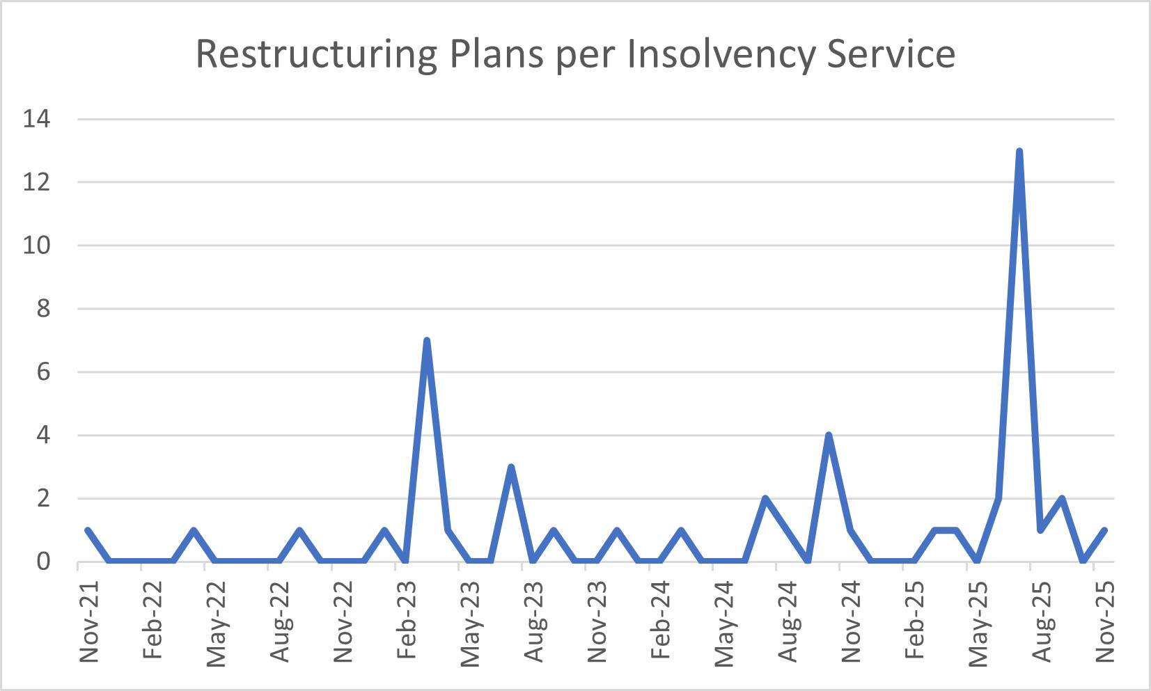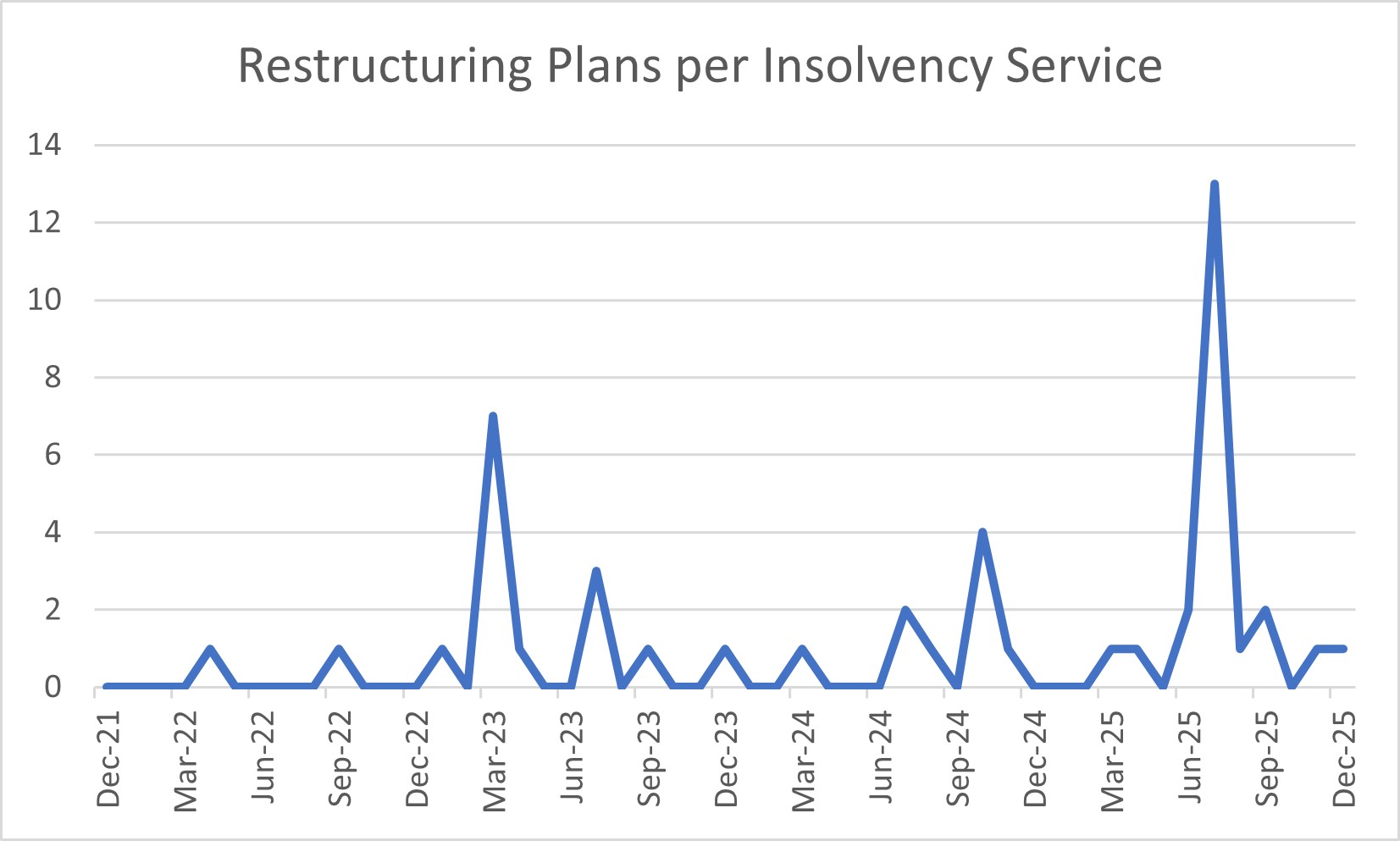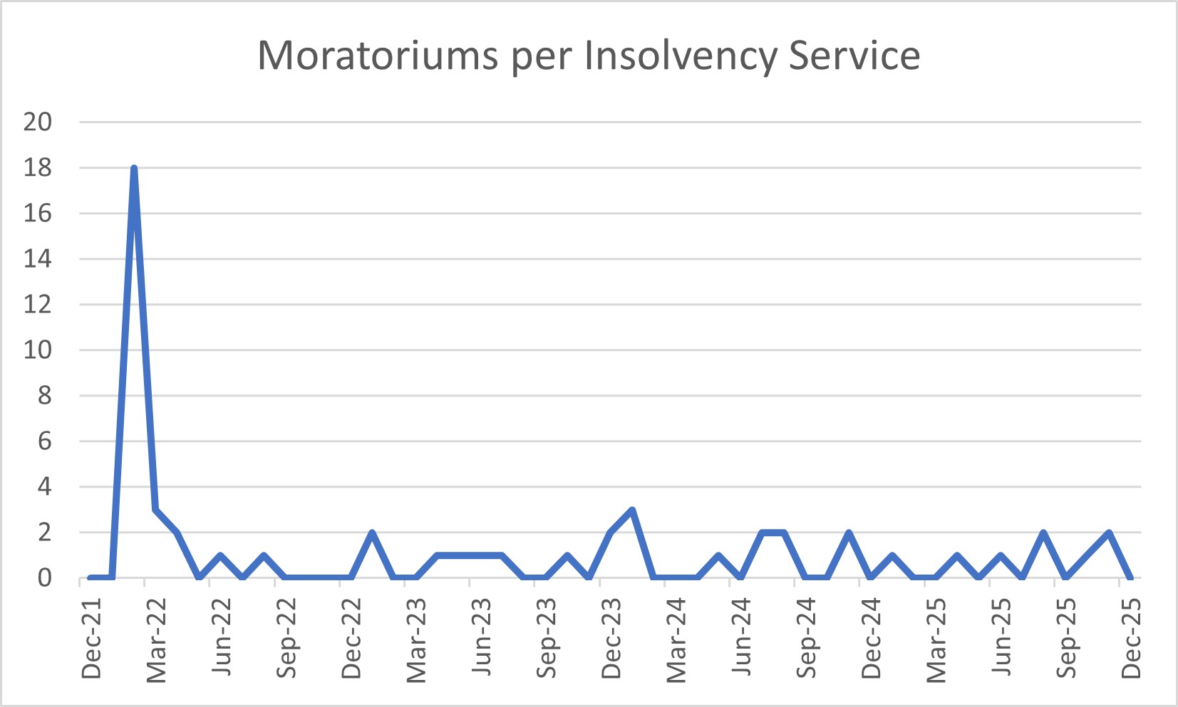 Although there are very few moratoriums and restructuring plans, I thought I might as well provide graphs for those too. I have drawn the data for these from the Insolvency Service’s monthly statistics.