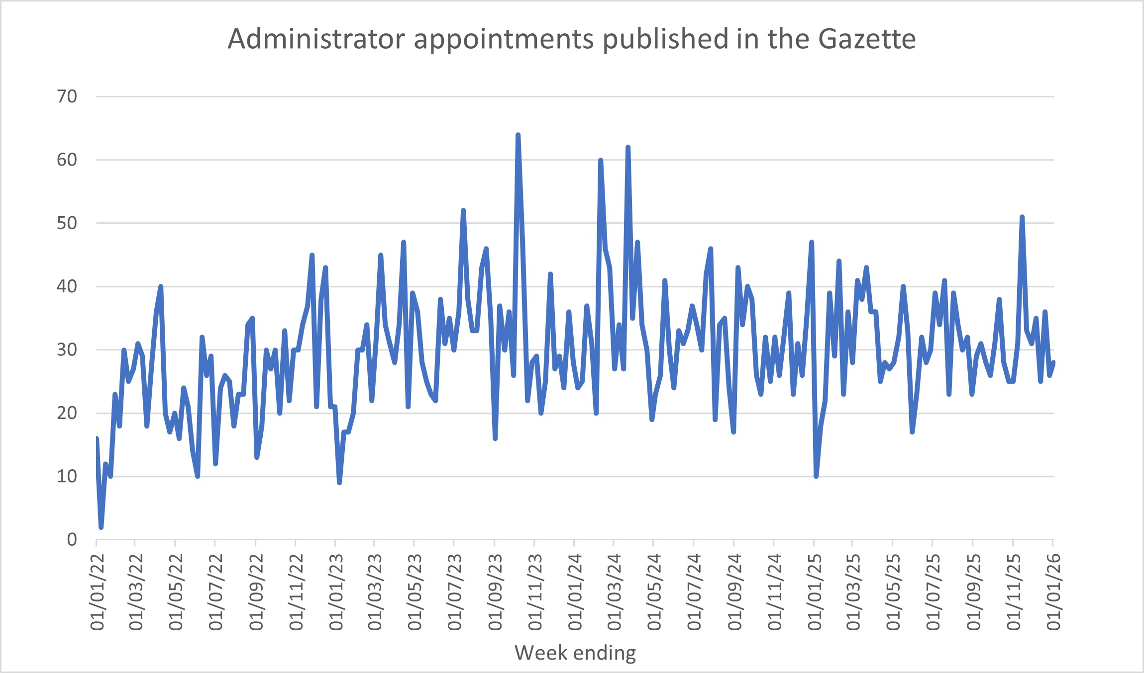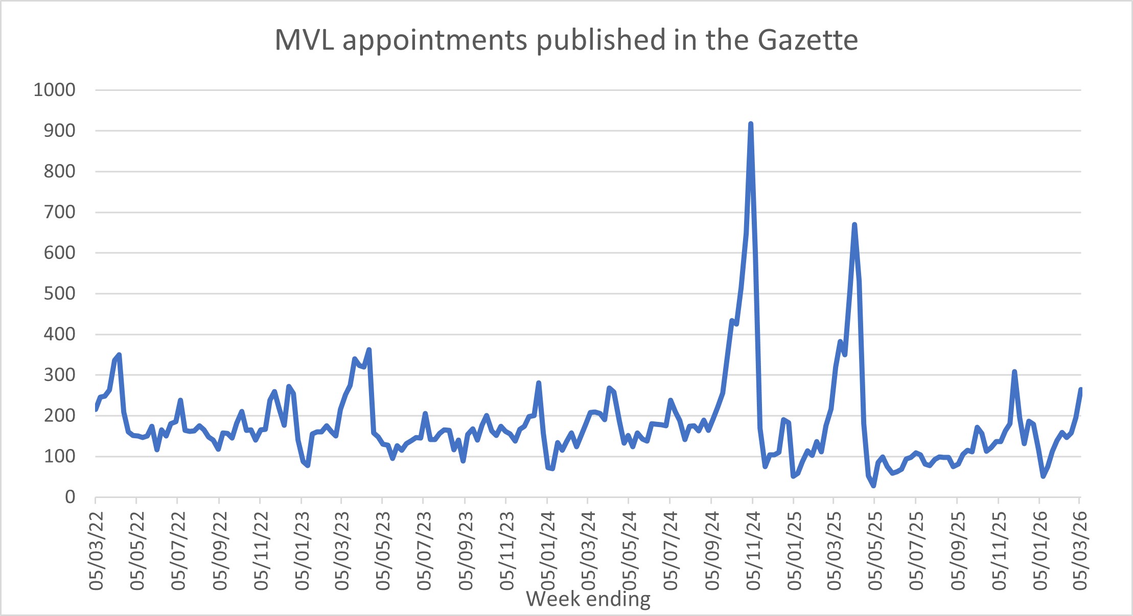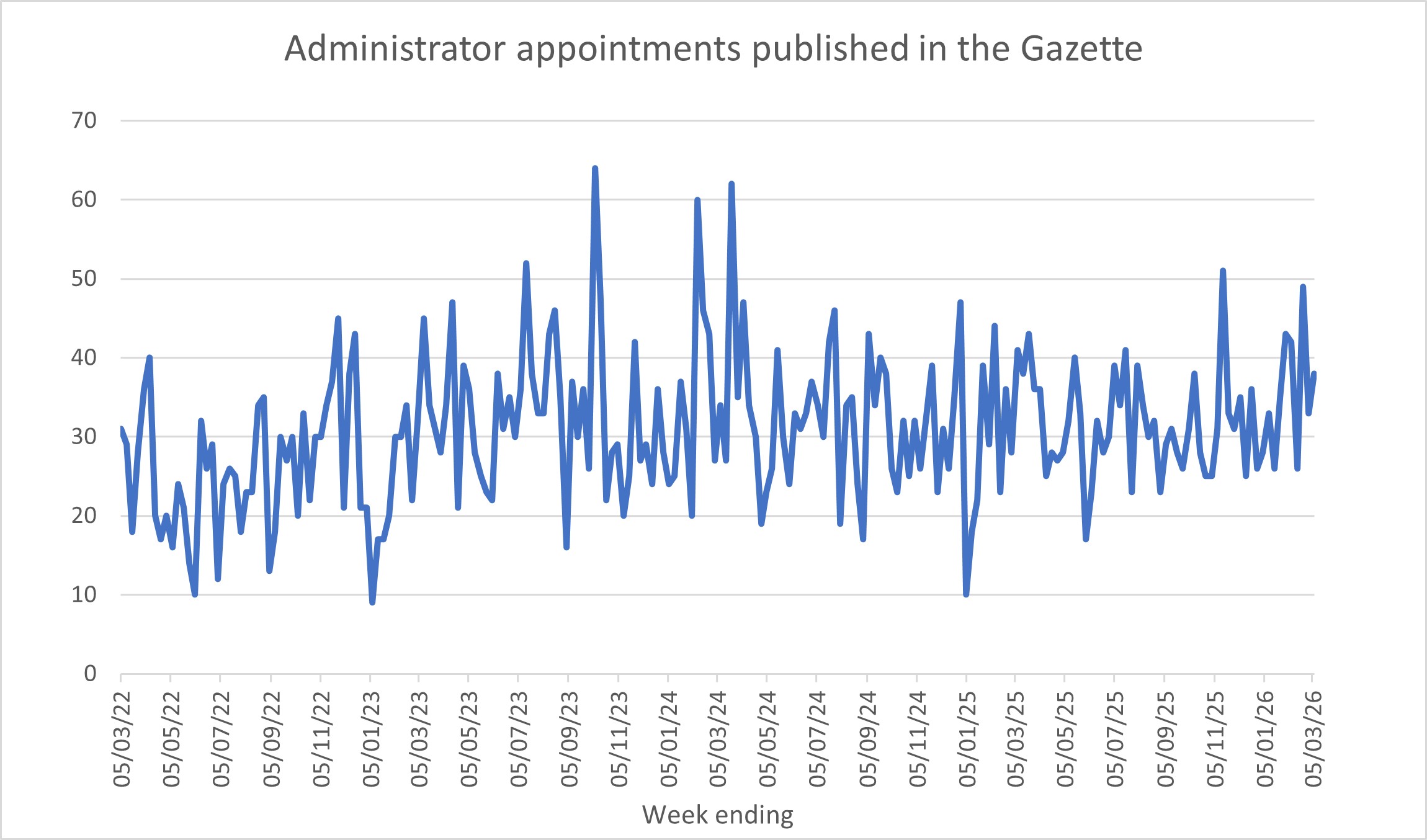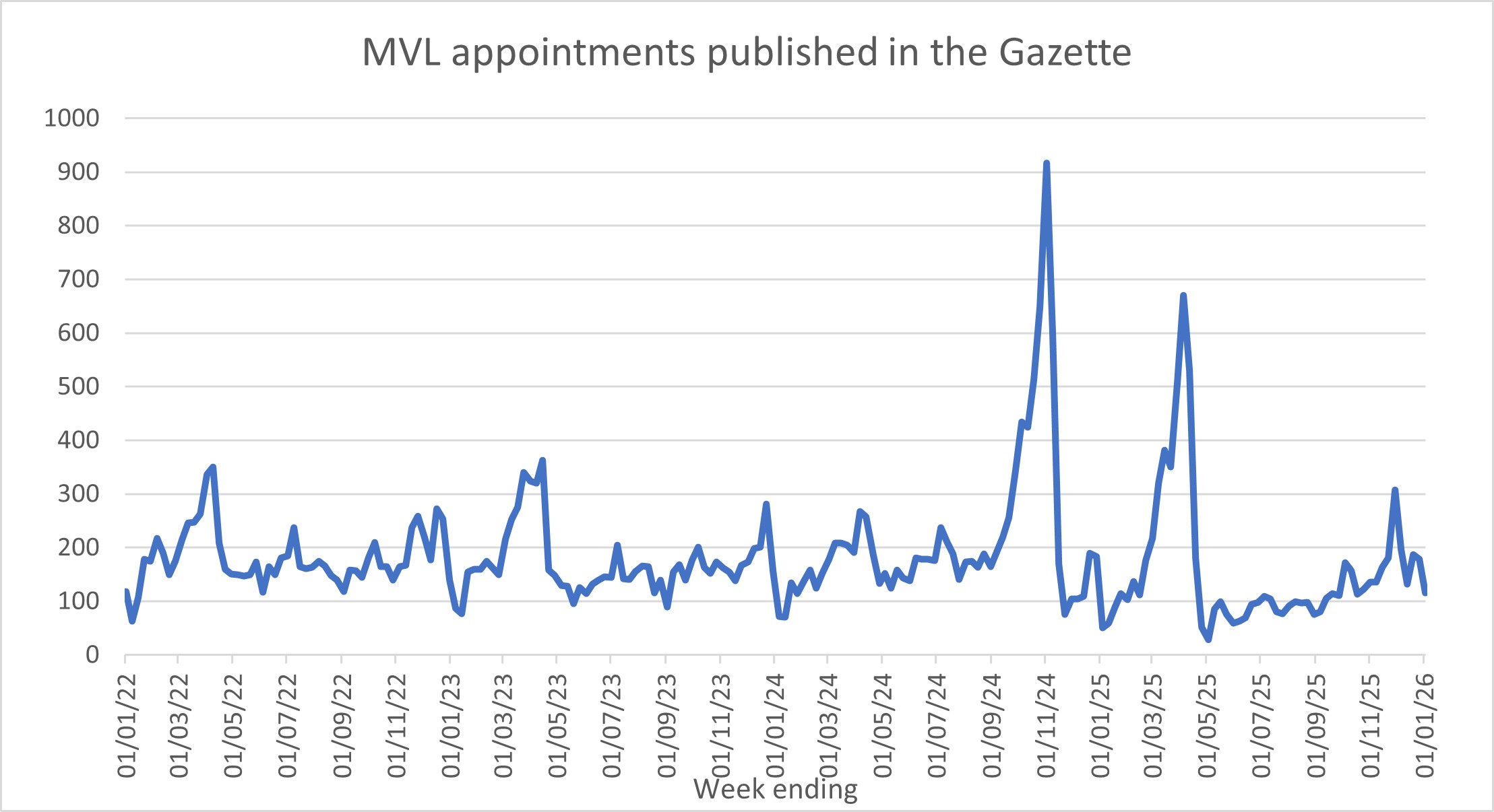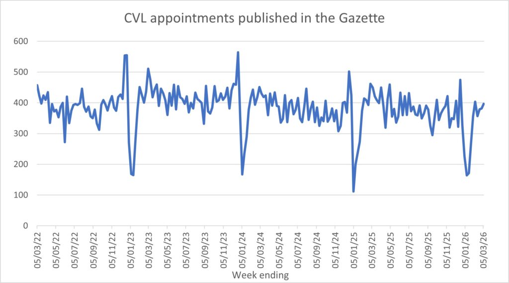 The following graphs show the numbers of notices of appointment published in the Gazette on a weekly basis. Therefore, they likely lag a week or so behind the actual dates of appointment. The graphs are updated each week.