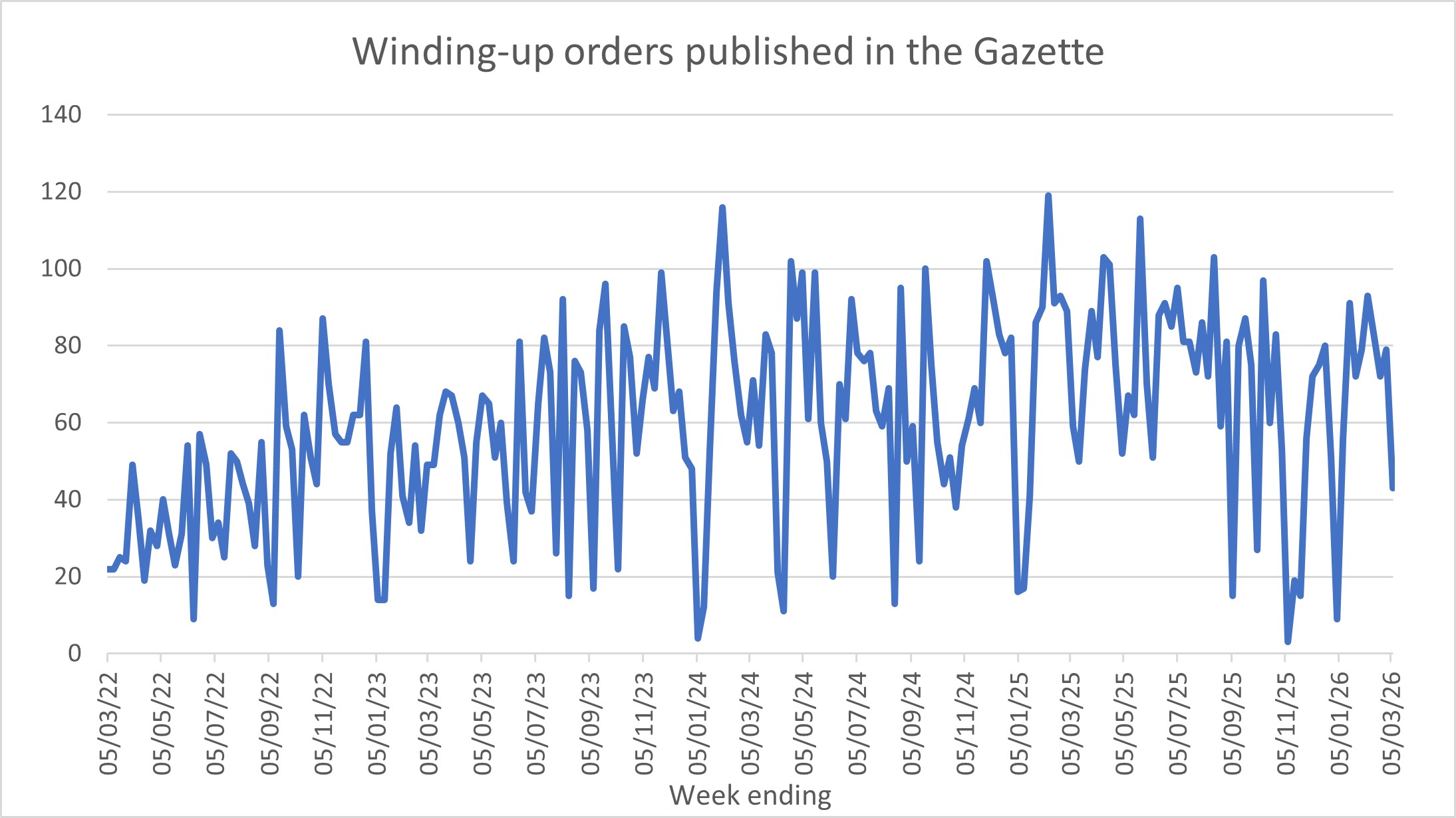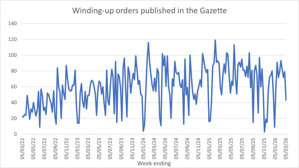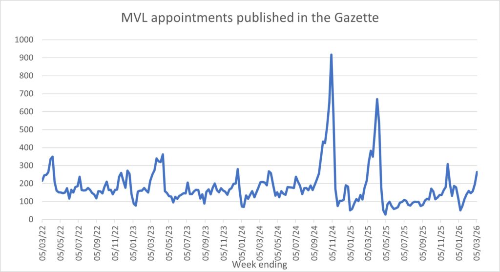The quarterly figures for dissolutions (voluntary and compulsory) have been drawn from Companies House’s statistics. Liquidations pale into insignificance against the number of dissolutions: over the last four reported quarters, there were over 750,000 dissolutions (with a 27% leap in Q2 2025/26) but only c.33,000 liquidations (all types).